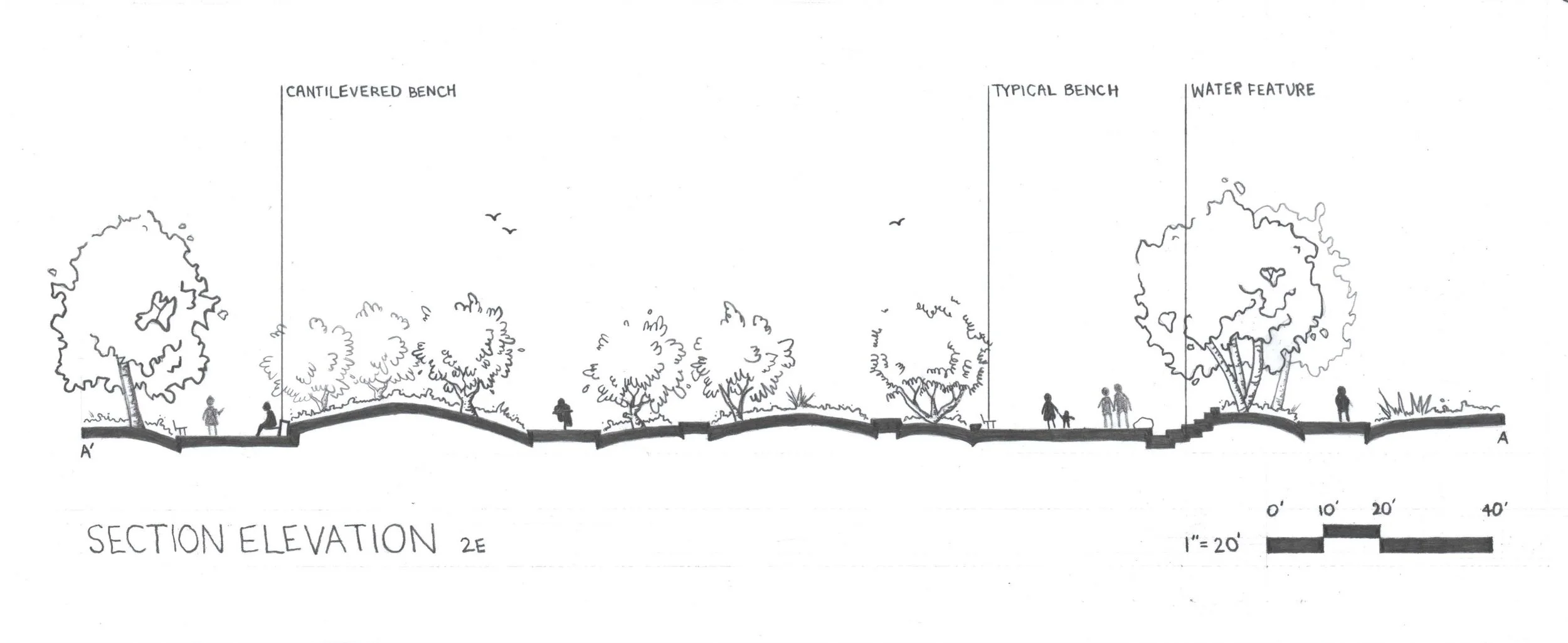 This work explores the existing built landscape of Tongva Park in Santa Monica, CA, designed by Field Operations, by hand drafting and drawing elements within the park as a plan, section, and perspective. This academic class taught me the importance of lineweights and different graphical viewpoints to best communicate a landscape and design intent. All graphics were drawn by hand on vellum using graphite pencils, black ink pens, and standard hand drafting equipment.